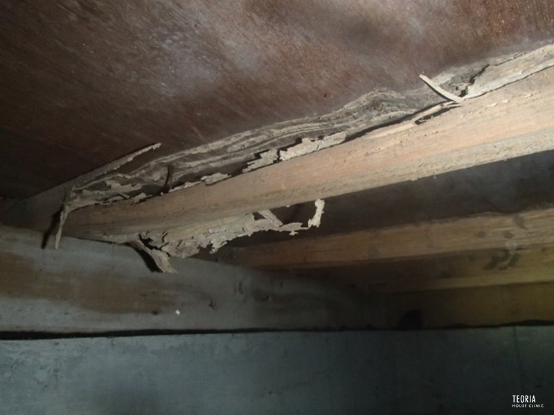 シロアリの通り道「蟻道(ぎどう)」が床組に走っています。茶色い線のようなものがシロアリの通り道です。