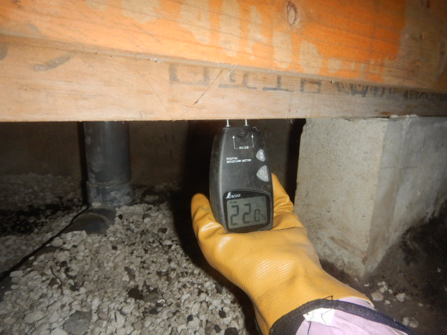 また、点検時に木材含水率を測定したところ、一部で含水率が20%を超えている箇所が確認されました。木材の含水率が高い状態は、シロアリが好む環境につながりやすく、腐朽やカビの原因にもなるため、駆除・予防対策に加えて湿気対策も必要であると考えられます。