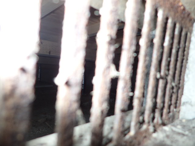 そのため1回目の点検では床下は、確認できる範囲を中心に点検を実施しています。増築部につながる通気口から床下の様子を覗くことができ、一部にシロアリの痕跡があることを確認しました。