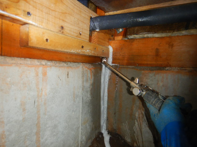 まずは床下の木部と土壌へシロアリ防除薬剤を処理します。薬剤は防蟻効果だけでなく、防腐効果も備えた薬剤のため、シロアリ対策と同時に木材の腐朽菌対策にもつながります。床下の湿気が気になる住宅では、木材の耐久性を守るうえでも重要な処理です。